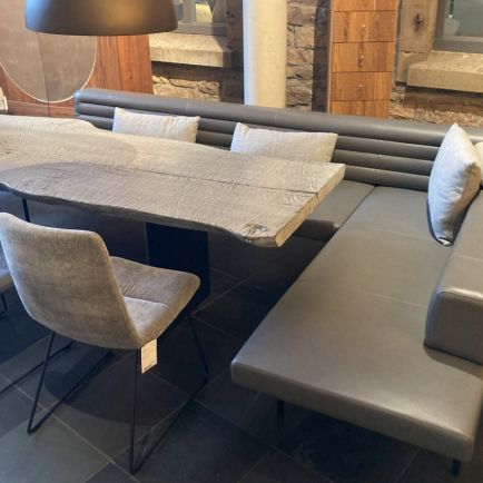 Esstisch Massivholz mit großer Eckbank und modernen Stühlen aus beigem Polsterstoff