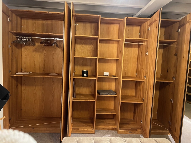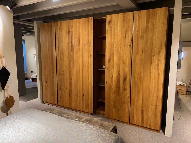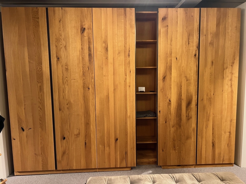 B. 335, H. 240, T. 60 cm,Eiche massiv geölt,Griff in Blaustahl