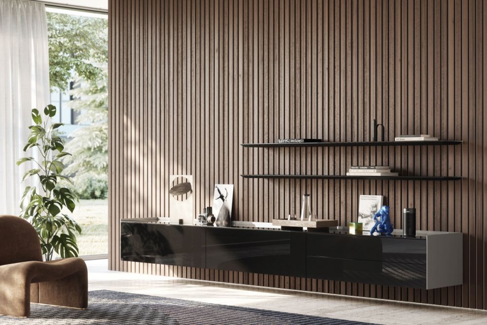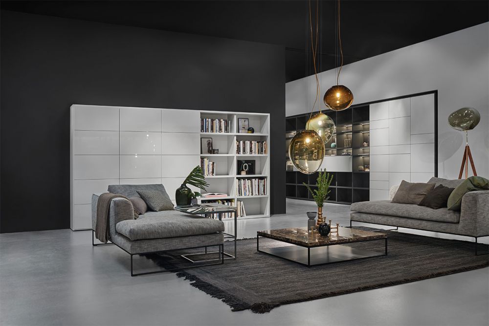 Zusätzliche Funktionen wie Schubladen, Schiebeelemente, Türen und Klappen gestalten offene und geschlossene Elemente, die Ruhe und Ordnung in den gesamten Raum bringen.